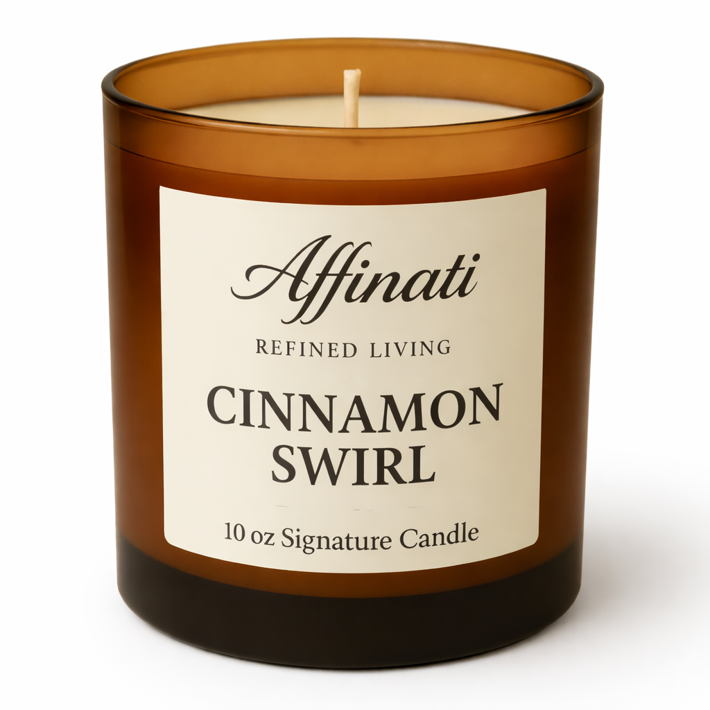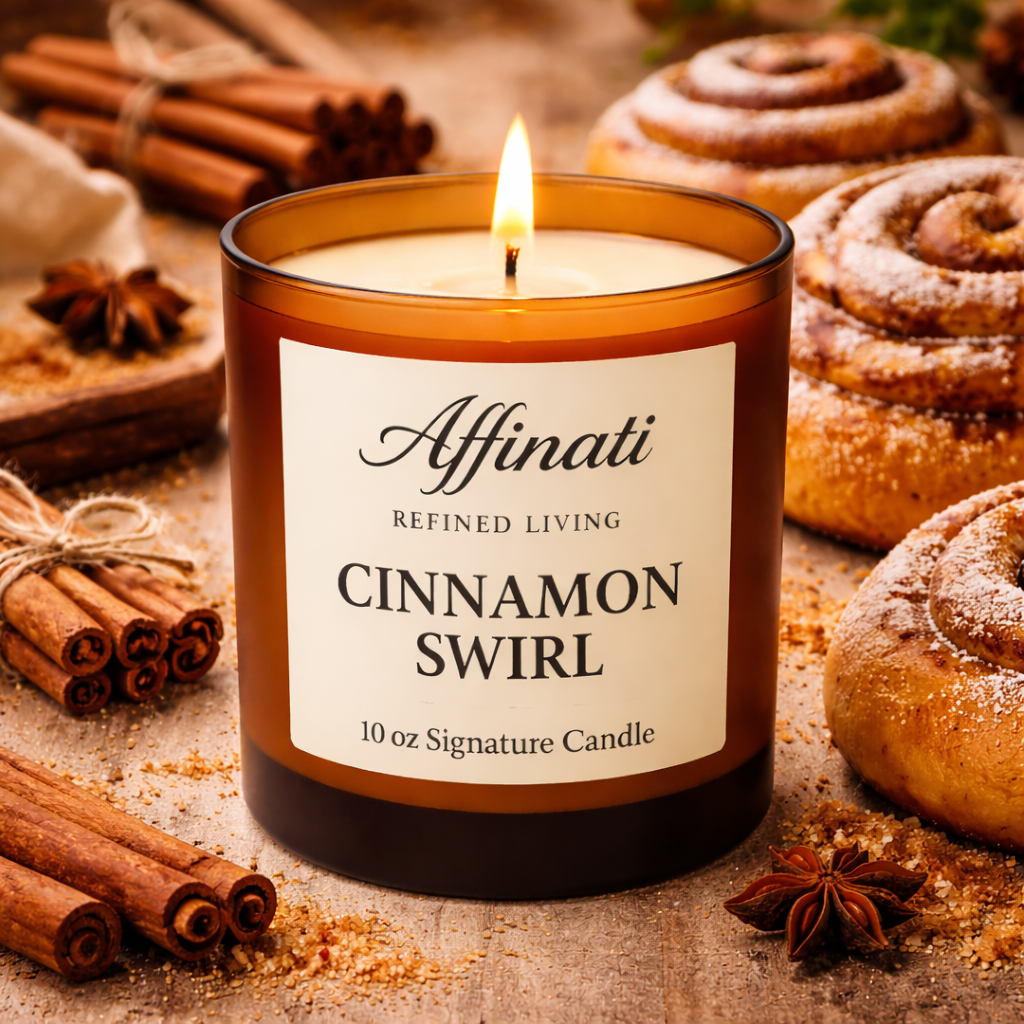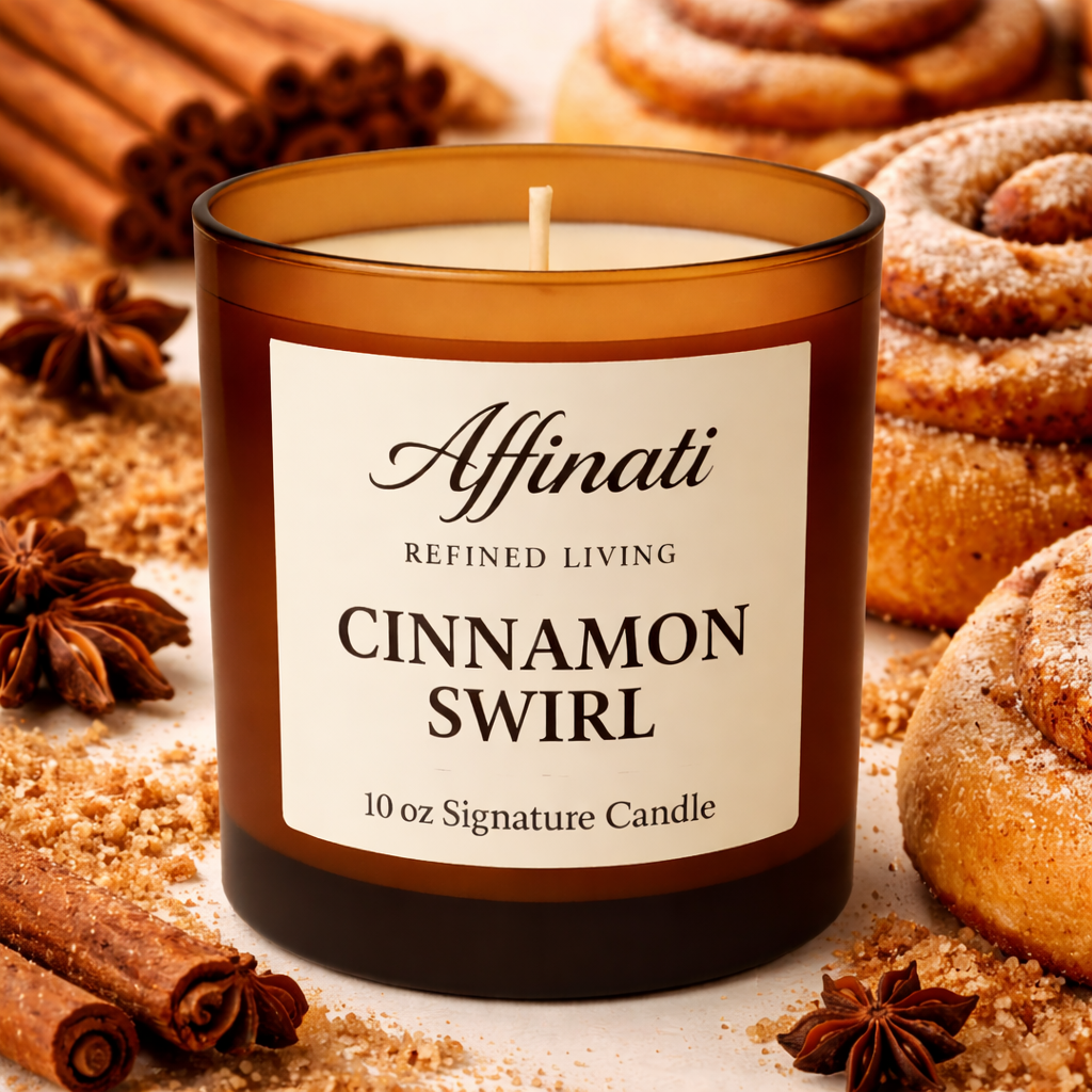 Φέρτε ζεστή άνεση και ακαταμάχητη άνεση στον χώρο σας με το Affinati Cinnamon Swirl Signature Candle – 10 oz. Εμπνευσμένο από φρεσκοψημένα κανέλας γλυκίσματα, αυτό το προσκαλών άρωμα συνδυάζει ζεστή κανέλα με απαλή γλύκα και κρεμώδη βανίλια για ένα άρωμα που νιώθεται απολαυστικό, παρηγορητικό και αβίαστα εκλεπτυσμένο.