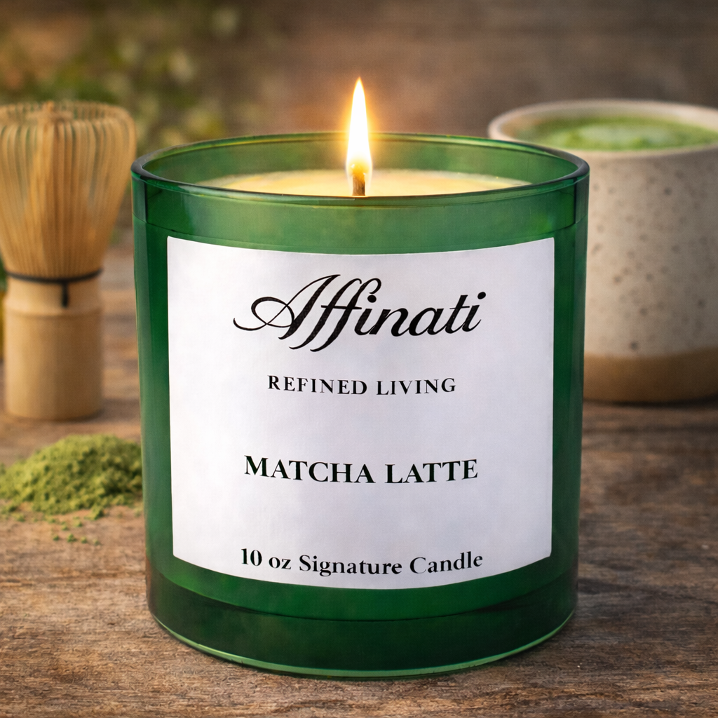 Luo lämmin, kahvilasta inspiroitunut tunnelma Affinati Matcha Latte Signature -kynttilällä – 10 oz, pehmeällä ja lohdullisella tuoksulla, joka on suunniteltu rauhallisen keskittymisen ja rentoutumisen hetkiin. Maanläheinen matcha sulautuu saumattomasti kermaisen maidon, pehmeän vaniljan ja lempeiden puiden kanssa, tuottaen tuoksun, joka tuntuu kodikkaalta, tasapainoiselta ja hiljaisesti virkistävältä. Valmistettu premium-laatuisesta soijavahaseoksesta, tämä kynttilä palaa puhtaasti ja levittää hienostuneen, tehokkaan tuoksun.