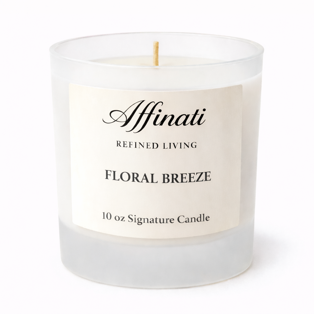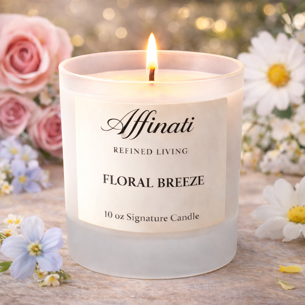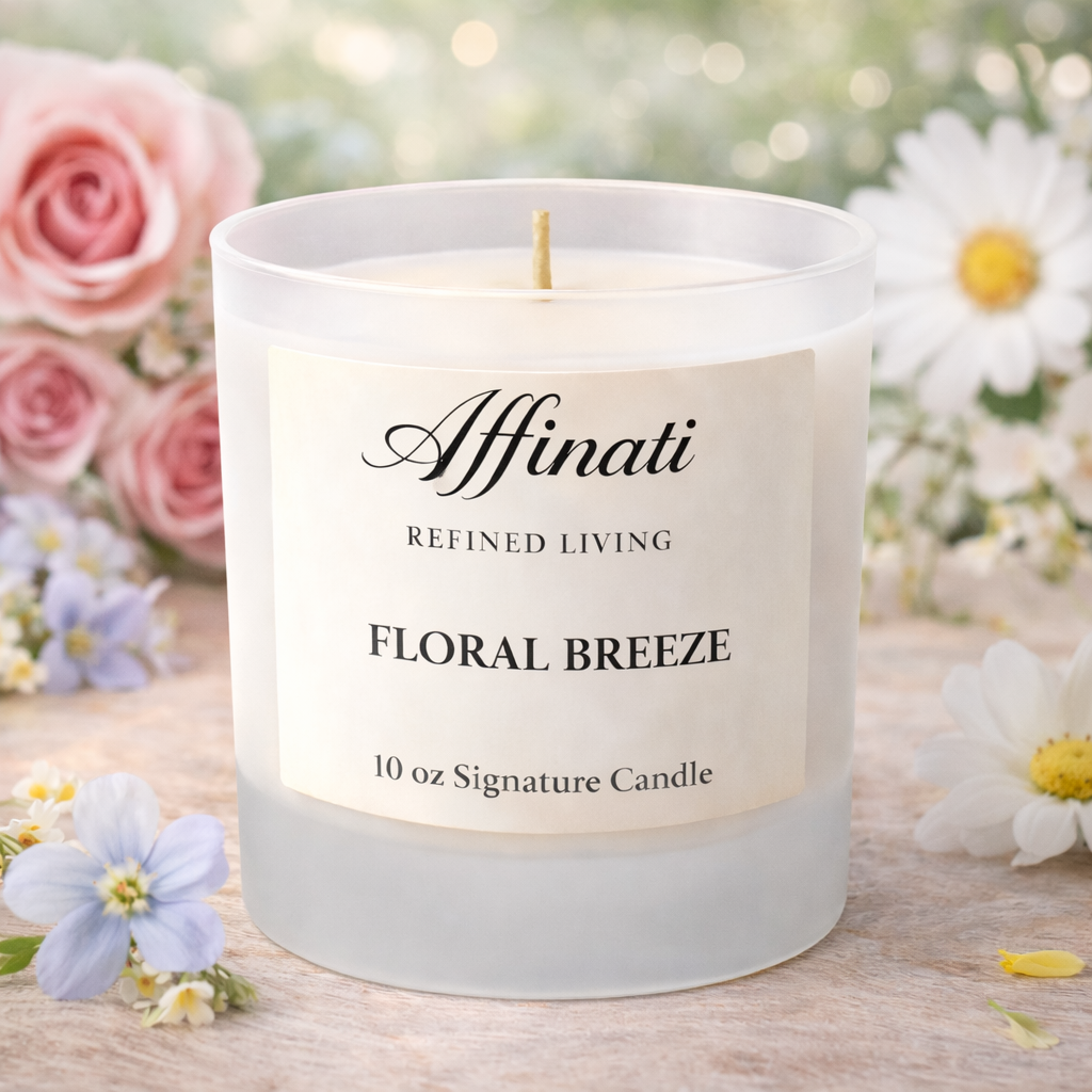 Affinati Floral Breeze 시그니처 캔들 – 10 oz로 가볍고 고요한 분위기를 연출하세요. 일상에서 즐기기 위해 디자인된 신선하고 우아한 향기로, 부드러운 꽃향기와 은은한 녹색 노트, 깨끗한 머스크가 어우러져 차분하고 세련되며 자연스럽게 매력적인 부드럽고 공기 같은 향을 만들어냅니다.