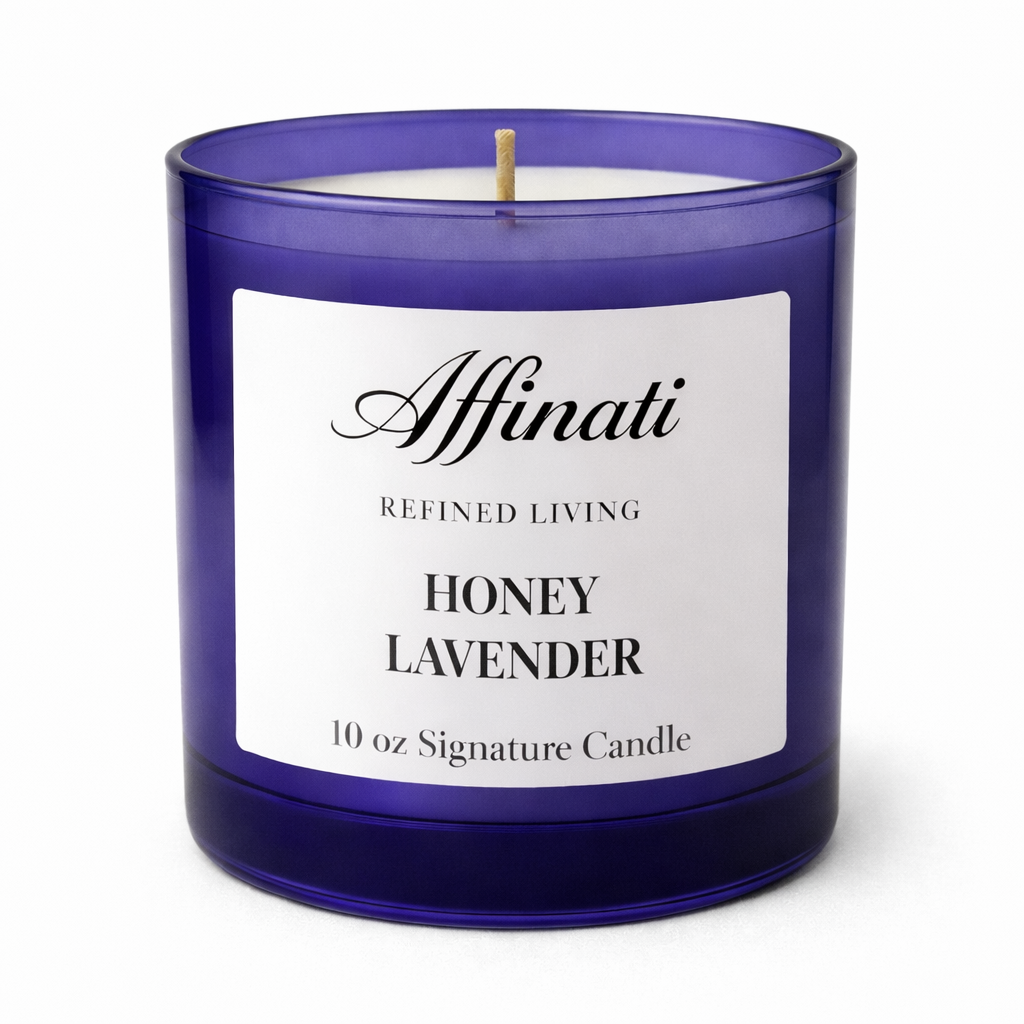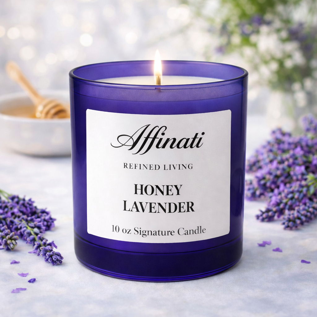 Affinati 허니 라벤더 시그니처 캔들 – 10 oz로 차분하고 편안한 분위기를 연출하세요. 부드러운 꽃향기 라벤더가 따뜻한 꿀 향과 완벽하게 어우러져 아늑하고 부드러우며 균형 잡힌 진정 효과를 선사합니다.