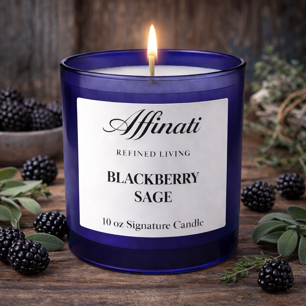 Hev hverdagslivet med Affinati Blackberry Sage Signature Candle – 10 oz, en livlig men jordnær duft designet for balanse. Moden bjørnebær blander seg sømløst med frisk salvie og subtile jordaktige undertoner, og skaper en duft som føles både energigivende og beroligende.