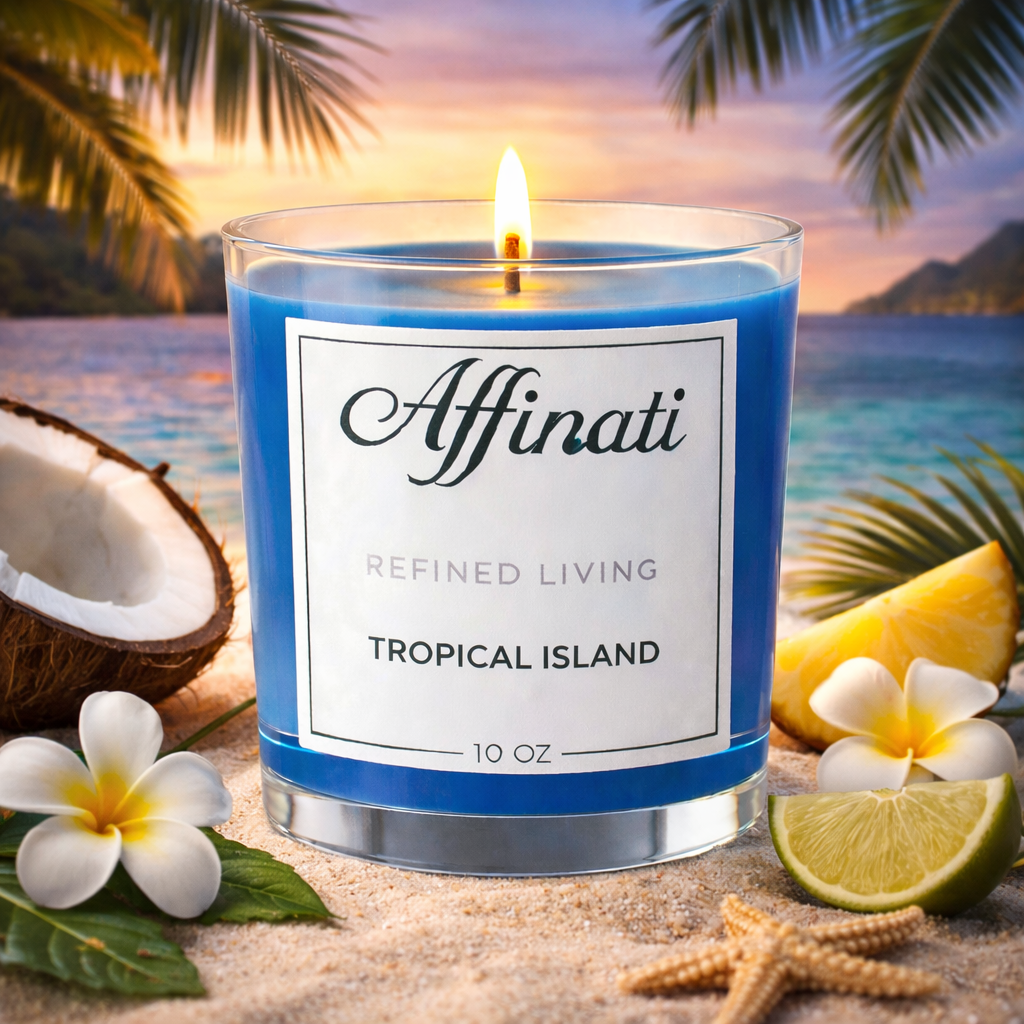 Tropical Island transporta você para praias banhadas pelo sol. Frutas tropicais vibrantes se misturam com notas cremosas para uma fragrância que transmite calor, relaxamento e vontade de fugir para um paraíso.